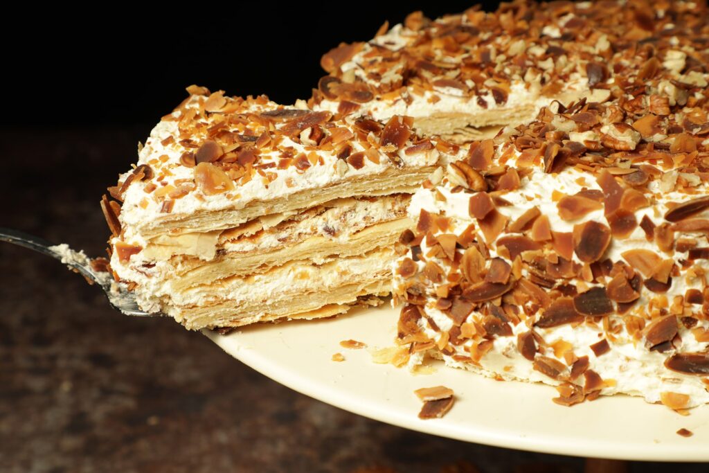 El Mil Hojas de Almendra es un pastel para los amantes de las texturas crujientes. Capas de láminas de hojaldre azucarado se intercalan con una suave trufa de chocolate blanco, creando un contraste irresistible entre lo crocante y lo cremoso. Las almendras tostadas aportan un sabor sutilmente ahumado.