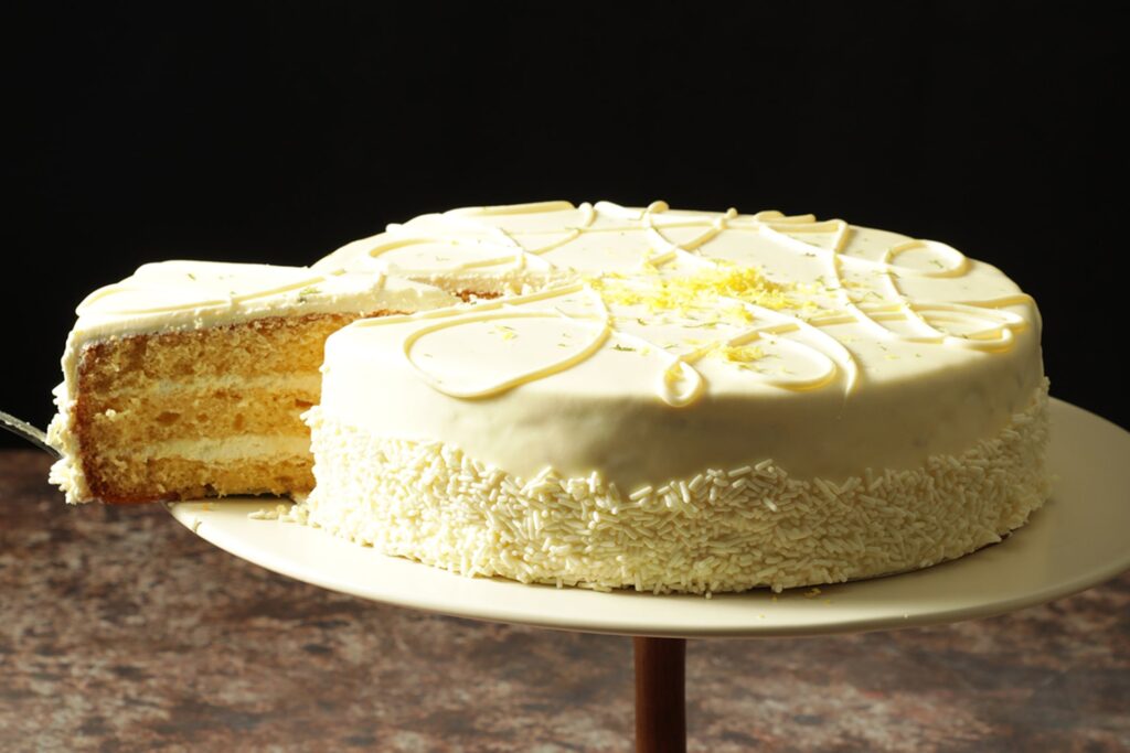 El pastel Santorini está elaborado con bizcocho de vainilla, ligeramente humectado con jarabe de limón, lo que le aporta jugosidad. En su interior lleva una ganache de limón que eleva el sabor cítrico y crea una mezcla perfecta de dulzura y acidez.