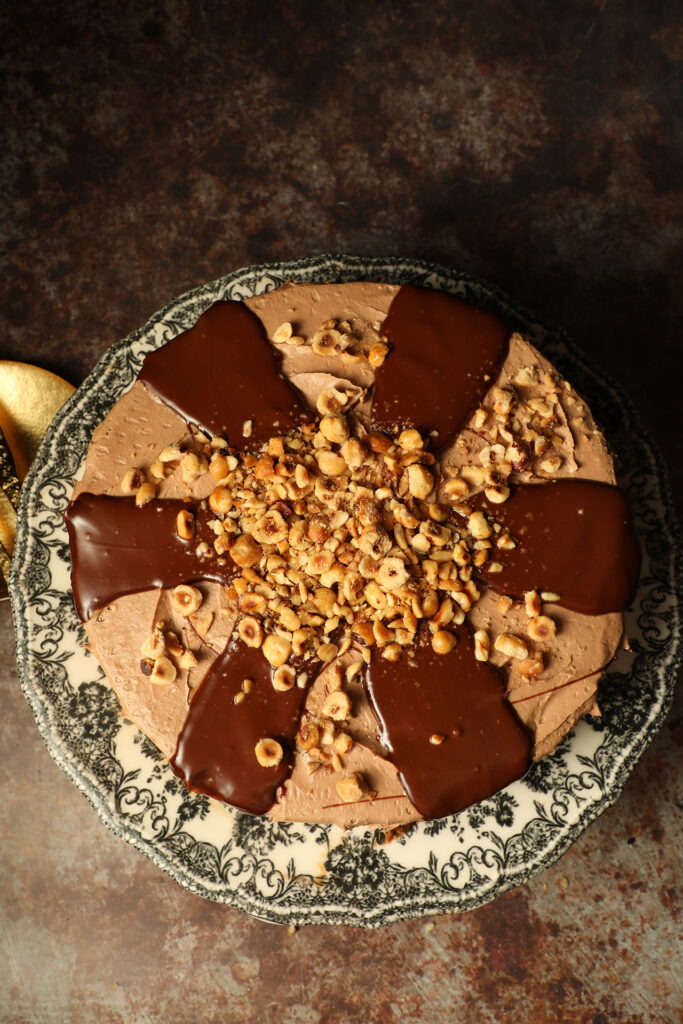 - Una cobertura de ganache de chocolate, elaborada con chocolate fundido y crema y decorada con avellanas tostadas.