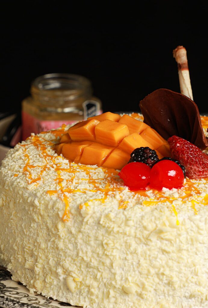 Este pastel está elaborado con pan de vainilla, jarabe de tres leches, crema de queso, mango. La cobertura es de crema para batir, chocolate blanco rallado, líneas de puré de mango, fruta y chocolatería.