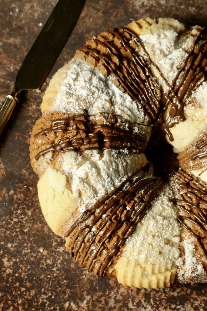 La rosca de Reyes Napolitana de Lecaroz eleva la tradición con un toque innovador. Su masa esponjosa combina los sabores clásicos de vainilla con el irresistible toque del chocolate.